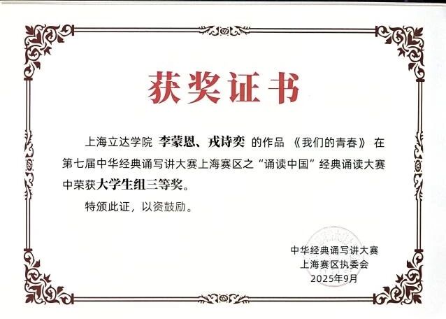 以声传文,以语承心。上海立达学院传媒学院积极响应号召,播音主持教研室的老师们全力组织、悉心指导播音专业学子踊跃参与本届大赛。参赛作品既有《我们的青春》中跨越时空的今古对话,也有《妈妈,稻子熟了》中的深情诉说,还有《北方》的苍茫抒怀……他们以声为媒,共读千年美文,聆听诗韵书香,用专业与热忱诠释经典,展现出新时代传媒学子的卓越风采与使命担当。