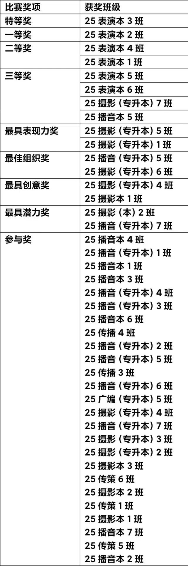 经过传媒学院各班级紧张激烈的角逐,竞选出了本次比赛的获奖班级,以下为分数统计表和最终的获奖名单: