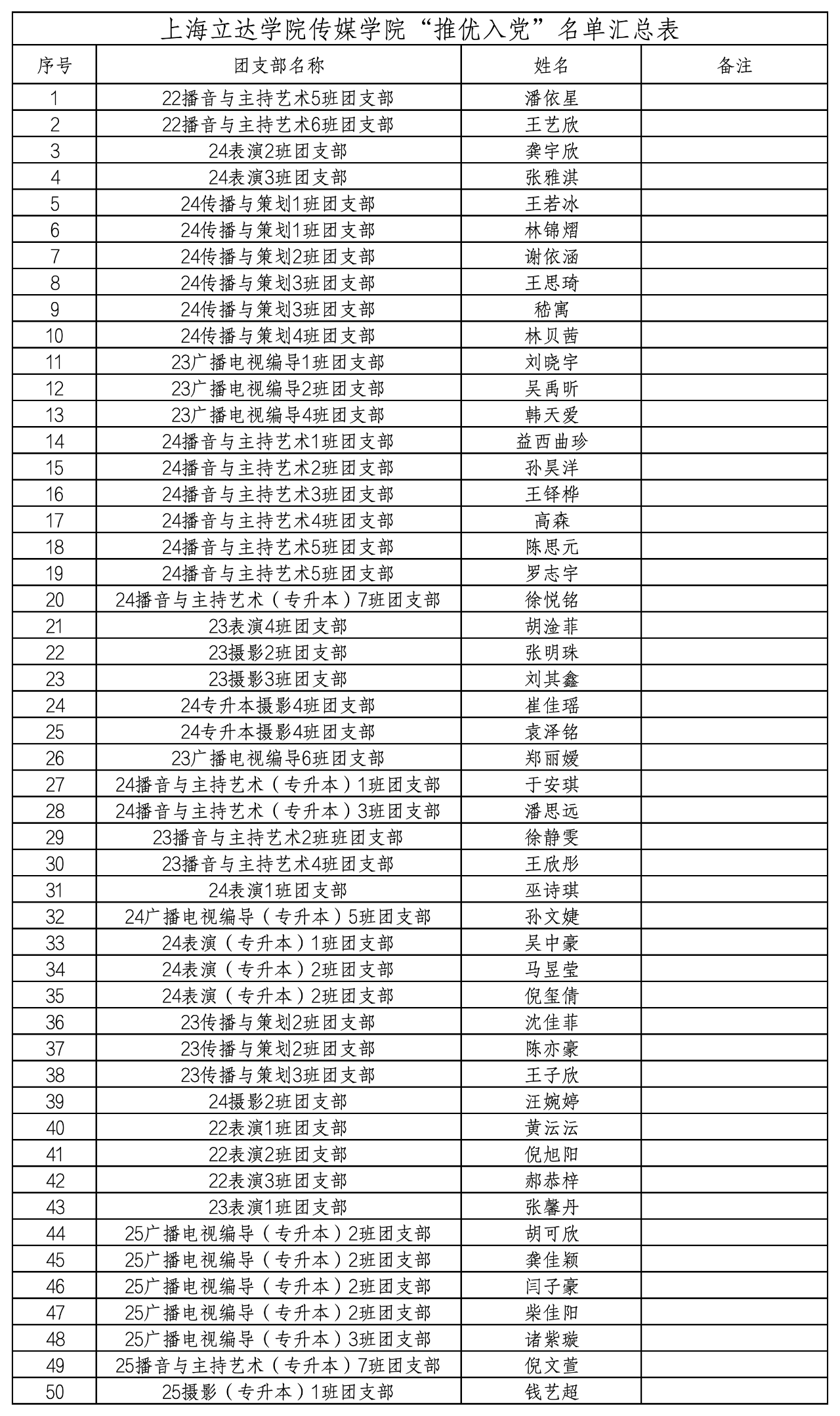 根据中青发【2019】9号共青团中央关于印发《共青团推优入党工作实施办法(试行)》,《中国共产党章程》以及《中国共产主义青年团章程》的相关规定,传媒学院各班级团支部召开支部团员大会,进行民主评议,以票决方式产生推荐对象,经学院团总支审核,现将传媒学院2025年下半年“推优入党”工作初步推荐名单公示,具体名单如下: