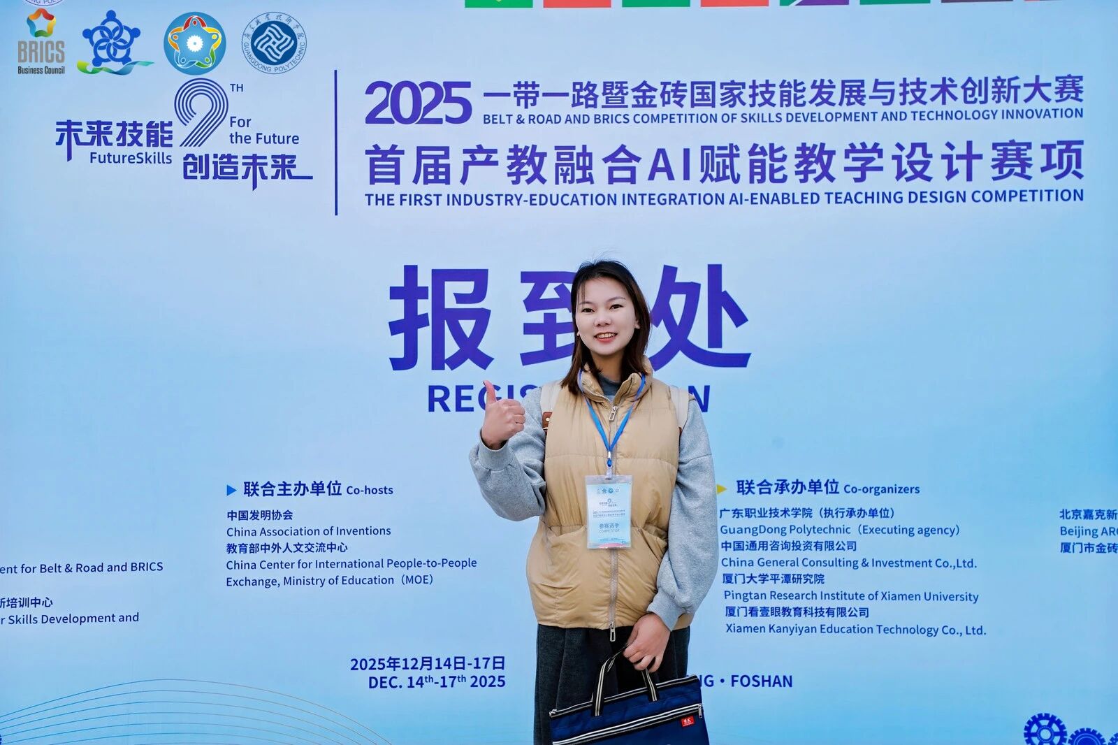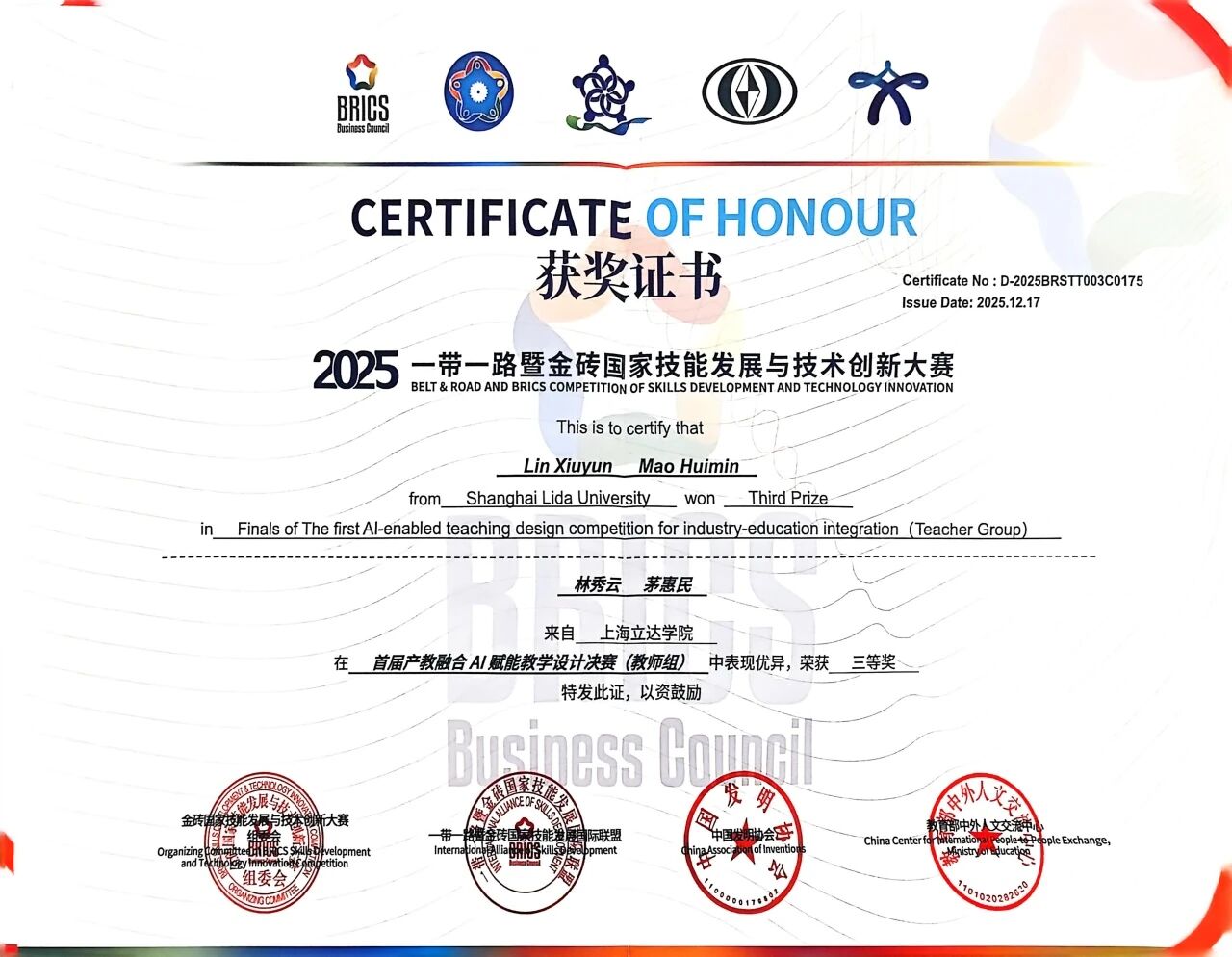 近日,传媒学院传播与策划专业林秀云老师与播音主持艺术专业茅惠民老师,在上海立达学院微影星火数字传媒产业学院的组织下,赴广东佛山参加了“2025一带一路暨金砖国家技能发展与技术创新大赛首届产教融合AI赋能教学设计大赛(教师组)”。两位老师凭借在《广告策划》课程中深度融合人工智能技术的教学创新成果,经过线上与线下两轮展示环节,荣获全国三等奖。