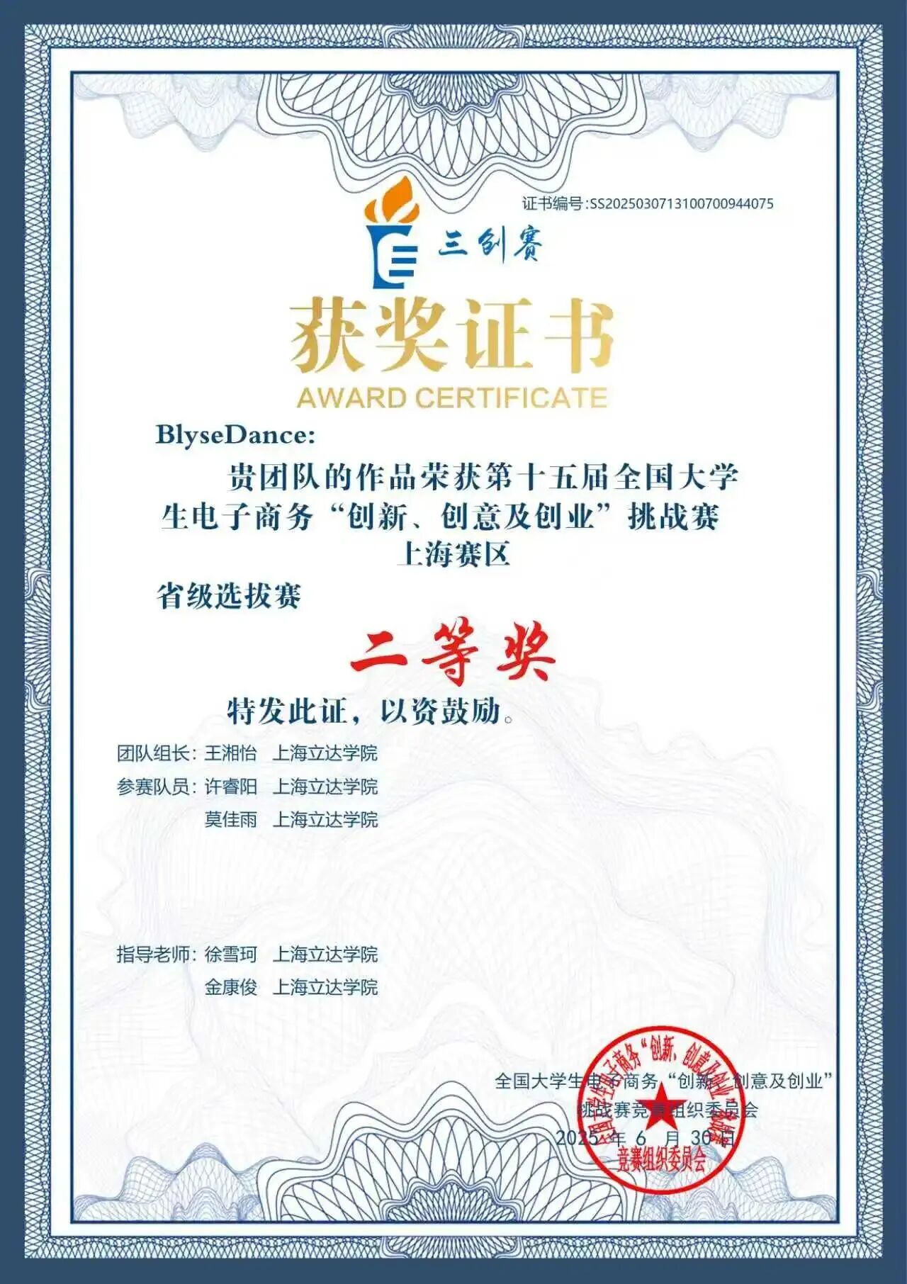 BlyseDance团队在第十五届全国大学生电子商务“创新、创意及创业”挑战赛上海赛区中荣获二等奖。